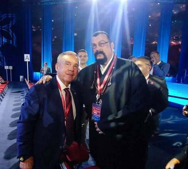 Пленар утырыш алдыннан ул үзенең күп кенә дуслары белән очрашты. Мәсәлән, Стивен Сигал Рөстәм Миңнехановка Татарстанны яратуын әйтеп, килергә вәгъдә итте. Алар инглиз телендә сөйләште.