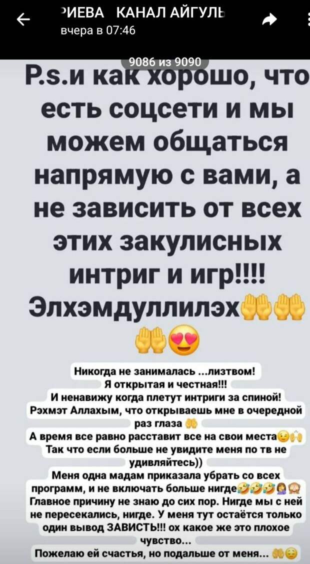 Мин ачык һәм гадел. Минем артымда интрига ясаучыларны күрәалмыйм. Рәхмәт, Аллаһым, чираттагы тапкыр күзләремне ачканың өчен рәхмәт. Вакыт барысын да үз урынына куячак. Мине ТВдан башка күрмәсәгез аптырамагыз. Бер ханым мине барлык программалардан алырга, башка бер урынга да кертмәскә кушкан. Төп сәбәбен дә белмим. Беркайчан да аралашкан, сүзгә килгән кешем түгел. Мин моны көнләшүдән дип уйлыйм. Аңа бәхет телим, тик миннән ерактарак», – дип белдергән җырчы.