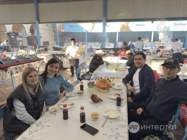 «Әйдәгез, бер җиргә алып барам!» – дип, дустыбыз безне шашлык, лагман һәм башка үзбәк милли ашларын пешереп сата торган урынга – бер таныш абзыена алып килде. «Инде ничә еллап Татарстаннан килгән артистларны, министрларны монда алып киләм», – дип, Нариман безне үзбәк сыйлары белән таныштырды. Озак та үтми, шампурга тезелгән шашлык та, бавыр да пешеп җитте. Чыннан да, әле иртә таңнан шашлык белән бавыр ашаганыбыз юк иде, төш түгелдер бит бу, дия-дия, авыз иттек. Ташкент чәен исә кәсәдән эчтек, җәймә (лепешка) белән каба-каба, ул да телеңне йотарлык тәмле иде…