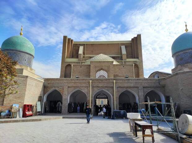 Аннан кая барабызмы? Ташкентның гаҗәп бер корылмасы – «Хәзрәти Имам комплексы»на юл алдык. Ул төнне бер дә йокы күрмәгән күзләр тагын да ачылыбрак китте, чөнки комплекс территориясендә мәрмәр таш җәйгәннәр, ә кояш яктысында ул күзләрне чагылдыра, әйтерсең кояш төшкән ап-ак карга караган кебек. Корылмалардан биредә Шәрык кулъязмалары китапханәсе, Муйи Мөбәрәк мәдрәсәсендә Хәлиф Госманның Коръән китабы урнашкан.