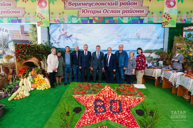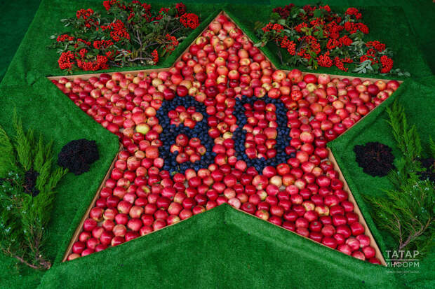 Без Югары Ослан районыннан килеп җиттек. Инде 10 нчы ел шушы күргәзмәне оештырабыз. Безнең бакчачылар һәрчак активлык күрсәтә. Быел Бөек Җиңүнең 80 еллык юбилее булгач, менә шундый Җиңү йолдызын ясап куярга булдык. Кызыл алмалардан йолдызны ясап куйдык, өстенә сливалар белән 80 санын яздык. Салютны миләшләр белән эшләдек, кәнәфер чәчәге һәм бузиналар белән бизәп тә җибәрдек. Ел саен шундый символик һәм оригиналь экспозицияләр уйлап чыгарырга тырышабыз, – дип бәян итте ул.