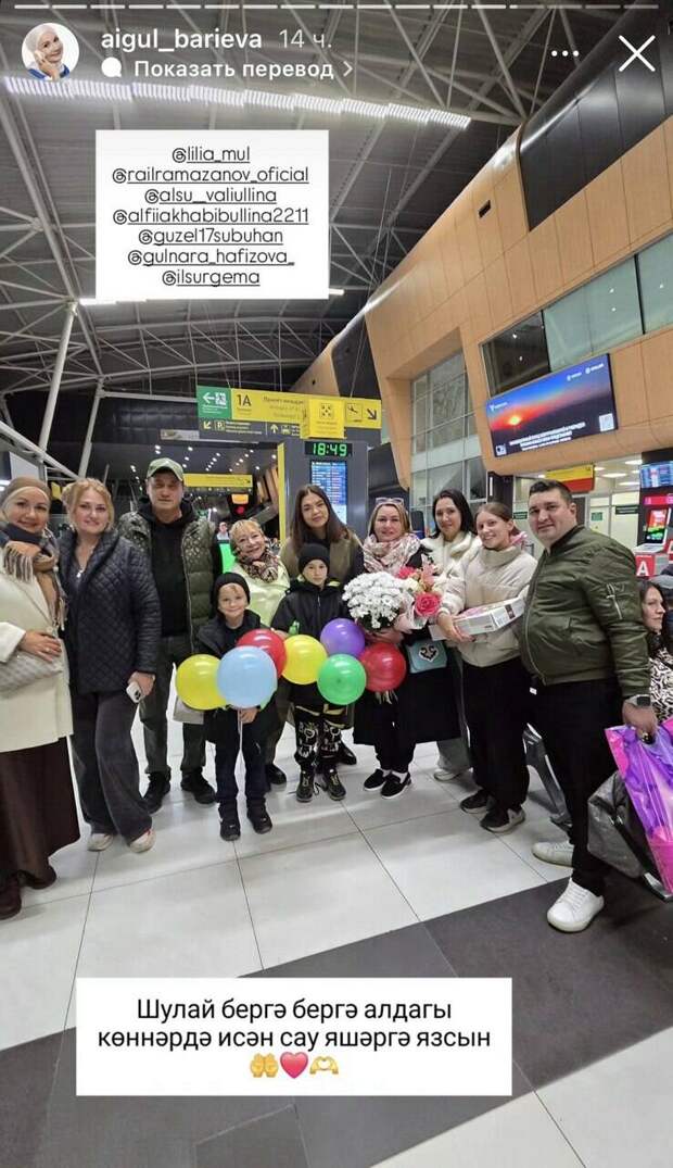 Айгөл Бариева социаль челтәрдә аэропортта көтү мизгелләре белән дә уртаклашты. «Ярты сәгатьтән кайтып җитә. Без, сюрприз ясап, аны каршы алабыз», – дип сөйли ул. Кызлар шарлар, күчтәнәчләр белән килгәннәр.