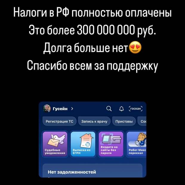 Гусейн үзе ышандырганча, Федераль салым хезмәтенә 300 миллионга якын бурычын ул бернинди ярдәмсез, үз көче белән түләгән һәм тау кадәр өелгән кәгазь акча да күрсәтте. Соңыннан социаль челтәрдә Мәскәүгә кайтырга җыенуына да ишарә ясап алды.