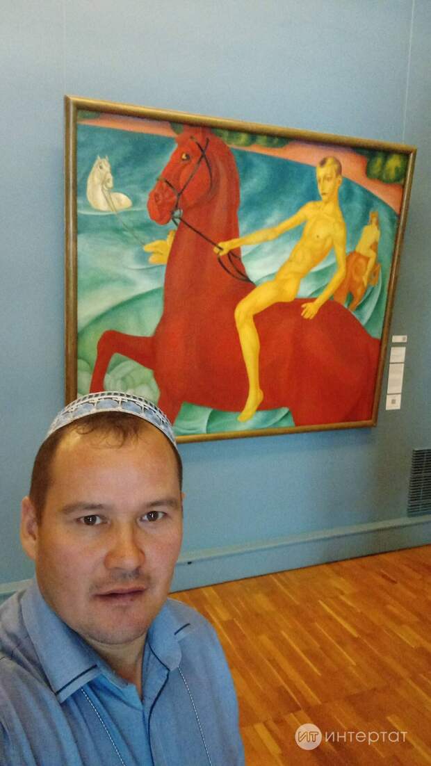 Азат Гомәров – «Кызыл атны коендыру» («Купание красного коня») картинасы янында. Картина авторы – Кузьма Петров-Водкин, ул аны 1912 елда иҗат иткән.